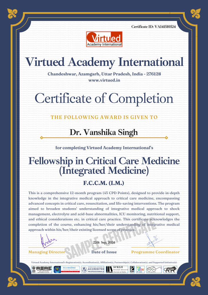 This 1-year, IAOTH, UK-accredited online Fellowship in Critical Care Medicine (Integrated Medicine) is for MBBS/ BAMS/ BHMS/ BUMS and other graduate healthcare practitioners. This fellowship is designed for healthcare professionals who want to broaden their understanding of Integrative Medicine / Integrated Medicine. This fellowship offers an in-depth curriculum that covers key areas of integrative medical approach to critical care, from initial patient resuscitation and shock management to advanced organ support and case-based collaborative learning. It emphasizes the management of a wide range of conditions including cardiovascular, respiratory, gastrointestinal, neurological, endocrine, and infectious diseases, focusing on both acute and chronic critical illnesses. This course is designed for continuing healthcare awareness and education and hence does not lead to a change in the existing professional licensing status of the graduates. Upon successful completion of the course, participants will be awarded Virtued's Fellowship in Critical Care Medicine (Integrated Medicine).