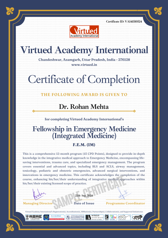 Upon successful completion of the course, participants will be awarded Virtued's Fellowship in Emergency Medicine (Integrated Medicine).